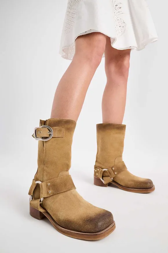Die Bikerboots Sind Aus Veloursleder Gefertigt Und Haben Einen Gewaxten Effekt. Eine Signature Schließe Und Kontrastier…